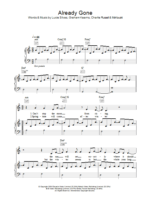 Download or print Lucie Silvas Already Gone sheet music, chords and digital score arranged for Piano, Vocal & Guitar Chords. This Pop score includes 6 page(s).