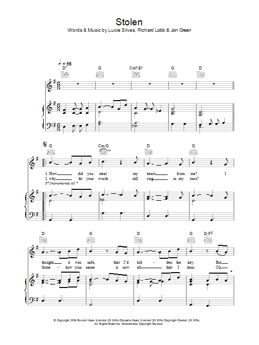 Download or print Lucie Silvas Stolen sheet music, chords and digital score arranged for Piano, Vocal & Guitar Chords. This Pop score includes 4 page(s).