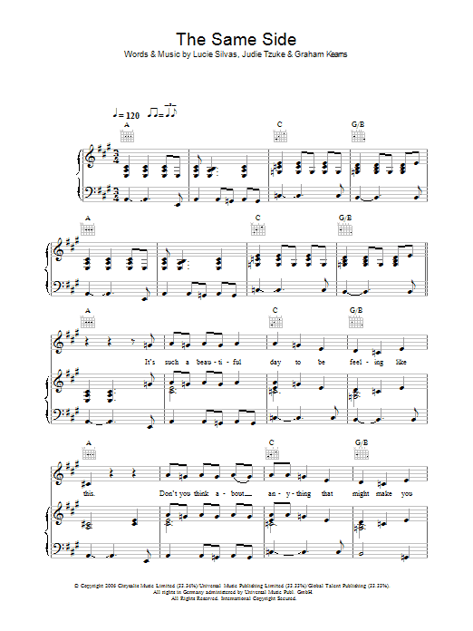 Download or print Lucie Silvas The Same Side sheet music, chords and digital score arranged for Piano, Vocal & Guitar Chords. This Pop score includes 7 page(s).