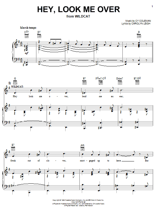 Download or print Cy Coleman Hey, Look Me Over sheet music, chords and digital score arranged for Piano, Vocal & Guitar Chords. This Musical/Show score includes 3 page(s).