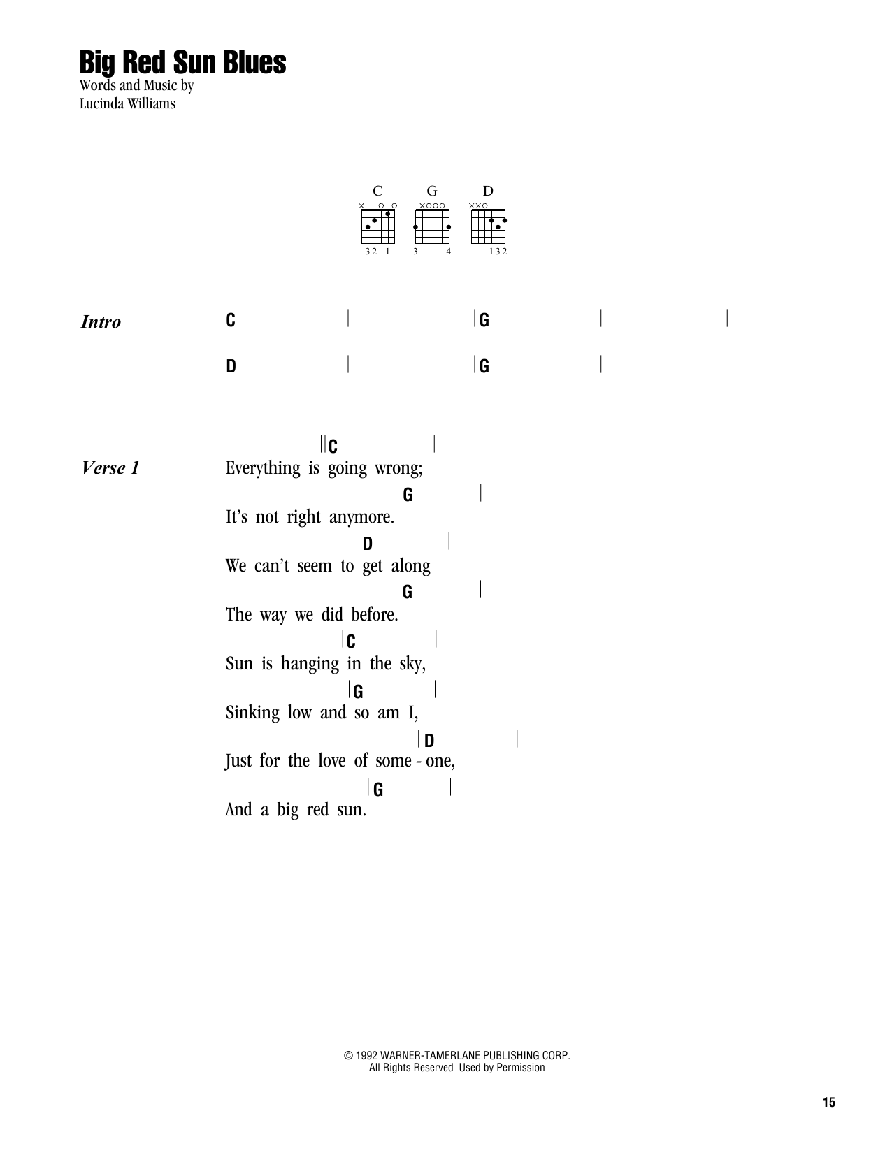 Download or print Lucinda Williams Big Red Sun Blues sheet music, chords and digital score arranged for Guitar Chords/Lyrics. This Country score includes 3 page(s).