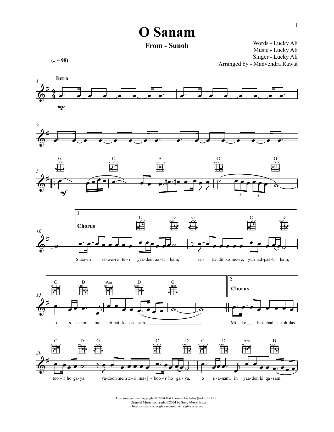 Download or print LUCKY ALI O Sanam sheet music, chords and digital score arranged for Lead Sheet / Fake Book. This Hindi score includes 2 page(s).