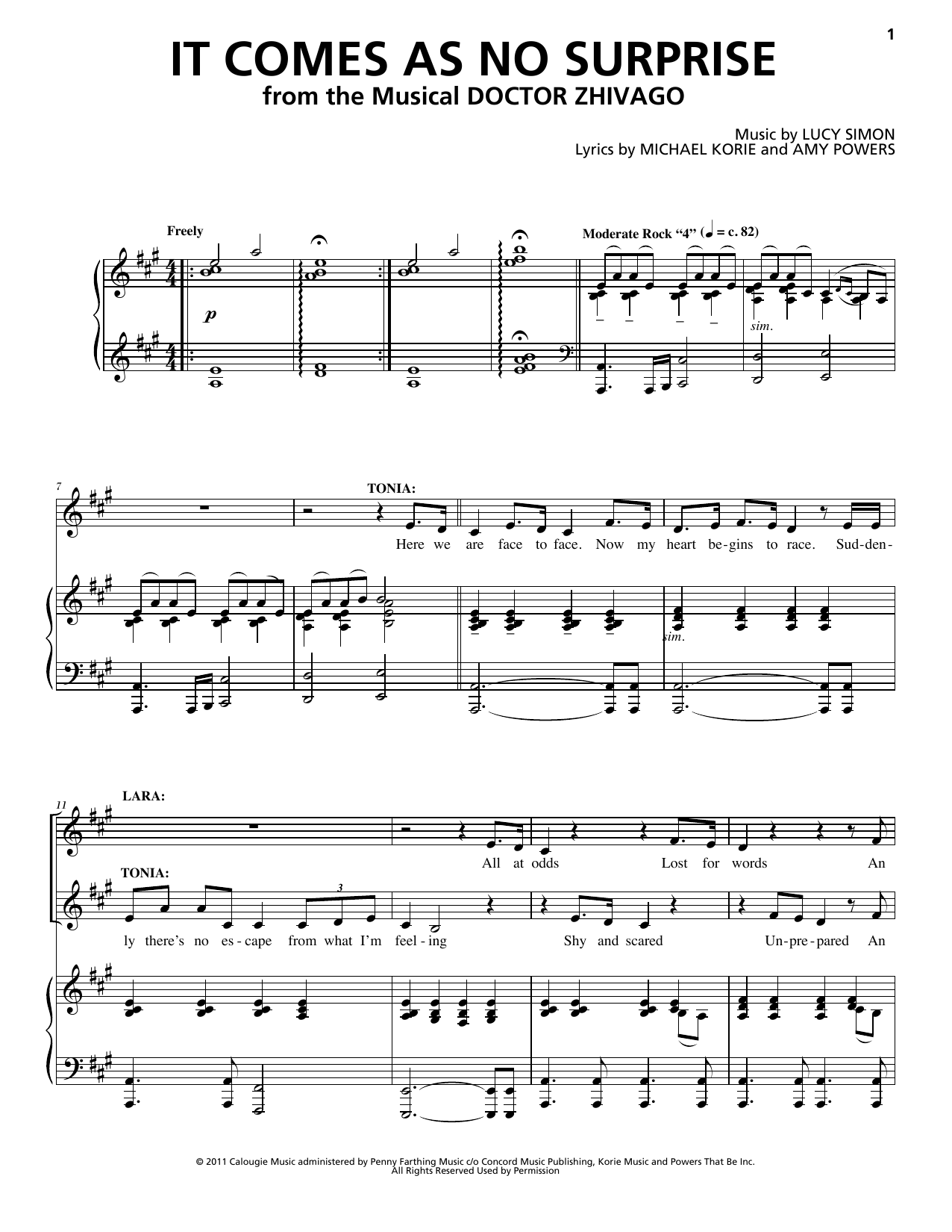 Download or print Lucy Simon, Michael Korie & Amy Powers It Comes As No Surprise sheet music, chords and digital score arranged for Piano & Vocal. This Musical/Show score includes 6 page(s).