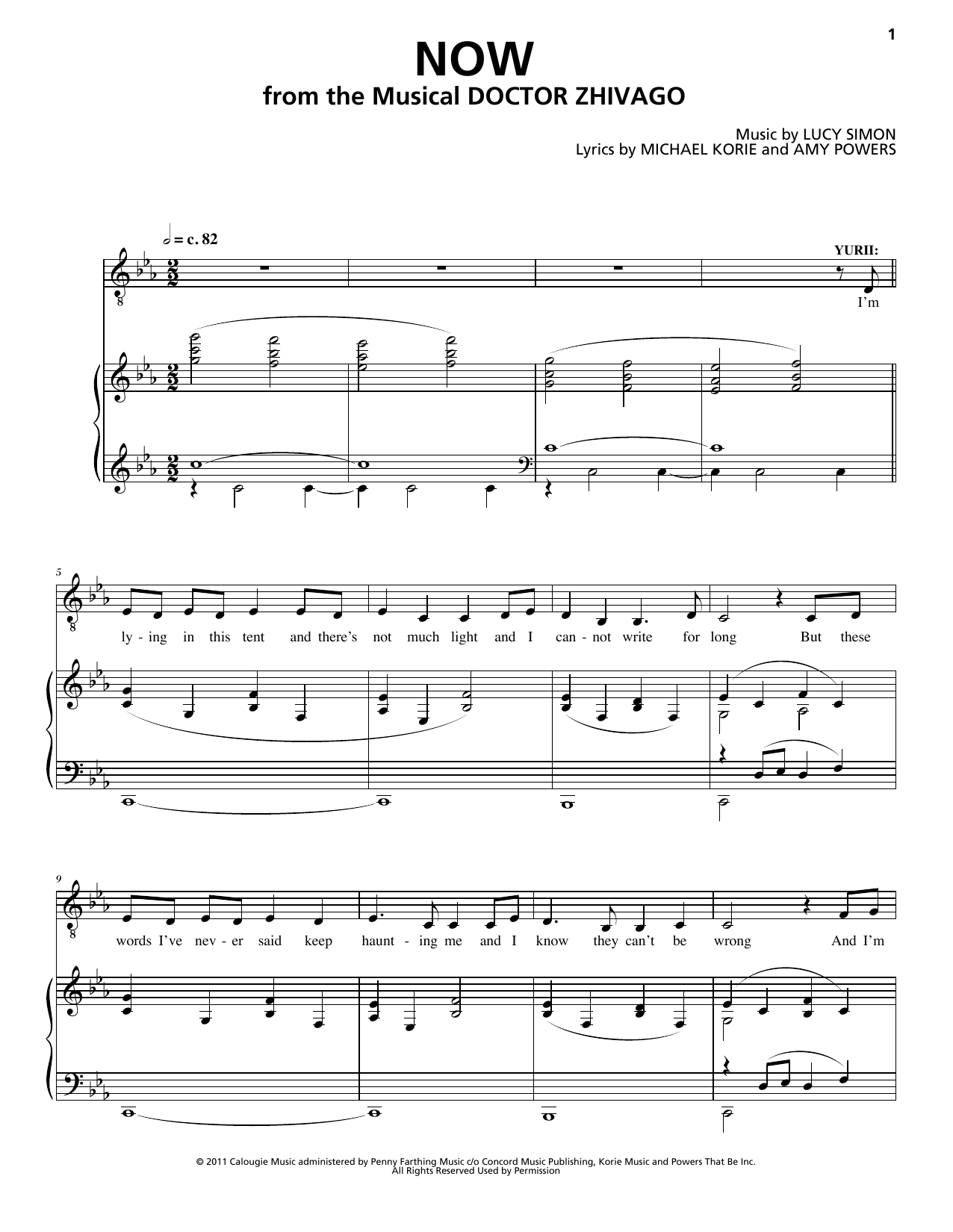 Download or print Lucy Simon, Michael Korie & Amy Powers Now (from Doctor Zhivago: The Broadway Musical) sheet music, chords and digital score arranged for Piano & Vocal. This Broadway score includes 7 page(s).