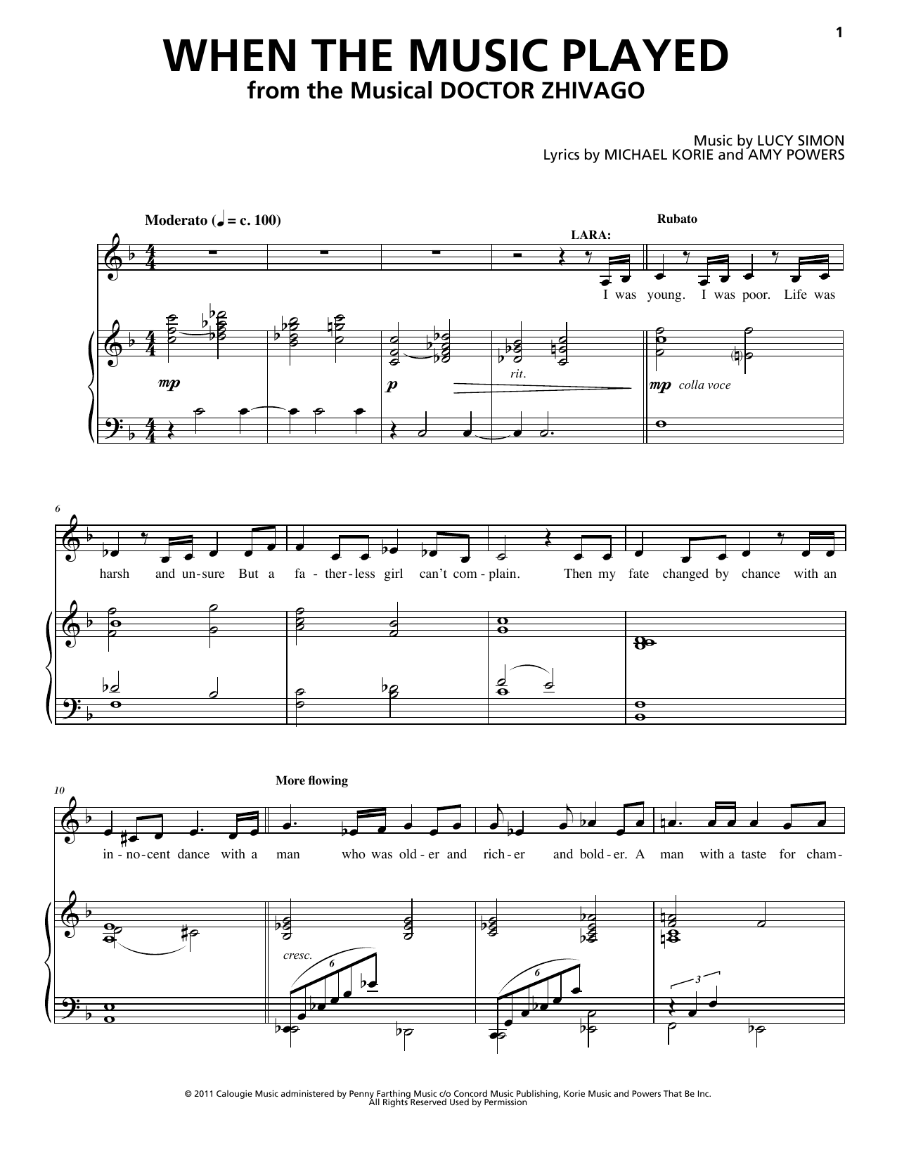 Download or print Lucy Simon, Michael Korie & Amy Powers When The Music Played (from Doctor Zhivago: The Broadway Musical) sheet music, chords and digital score arranged for Piano & Vocal. This Musical/Show score includes 9 page(s).