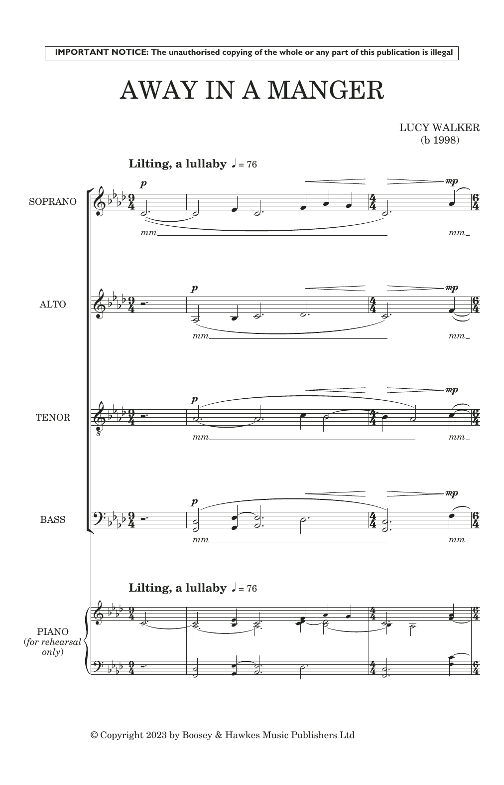 Download or print Lucy Walker Away In A Manger sheet music, chords and digital score arranged for Choir. This Christmas score includes 10 page(s).