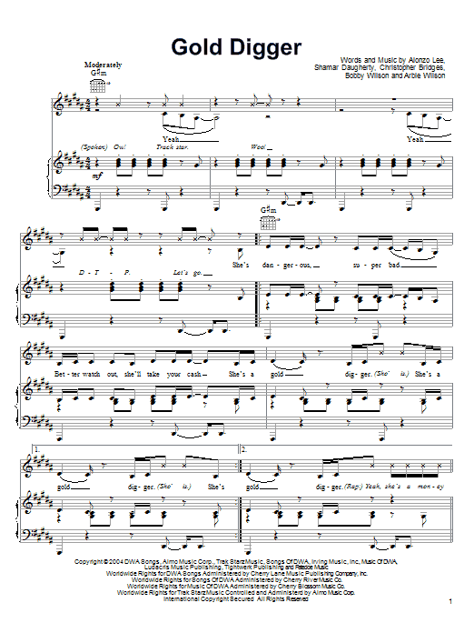 Download or print Ludacris featuring Bobby V. and Lil' Fate Gold Digger sheet music, chords and digital score arranged for Piano, Vocal & Guitar Chords (Right-Hand Melody). This Film/TV score includes 7 page(s).