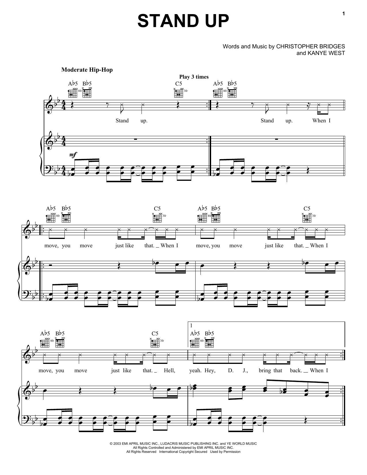 Download or print Ludacris Stand Up sheet music, chords and digital score arranged for Piano, Vocal & Guitar Chords (Right-Hand Melody). This Pop score includes 6 page(s).