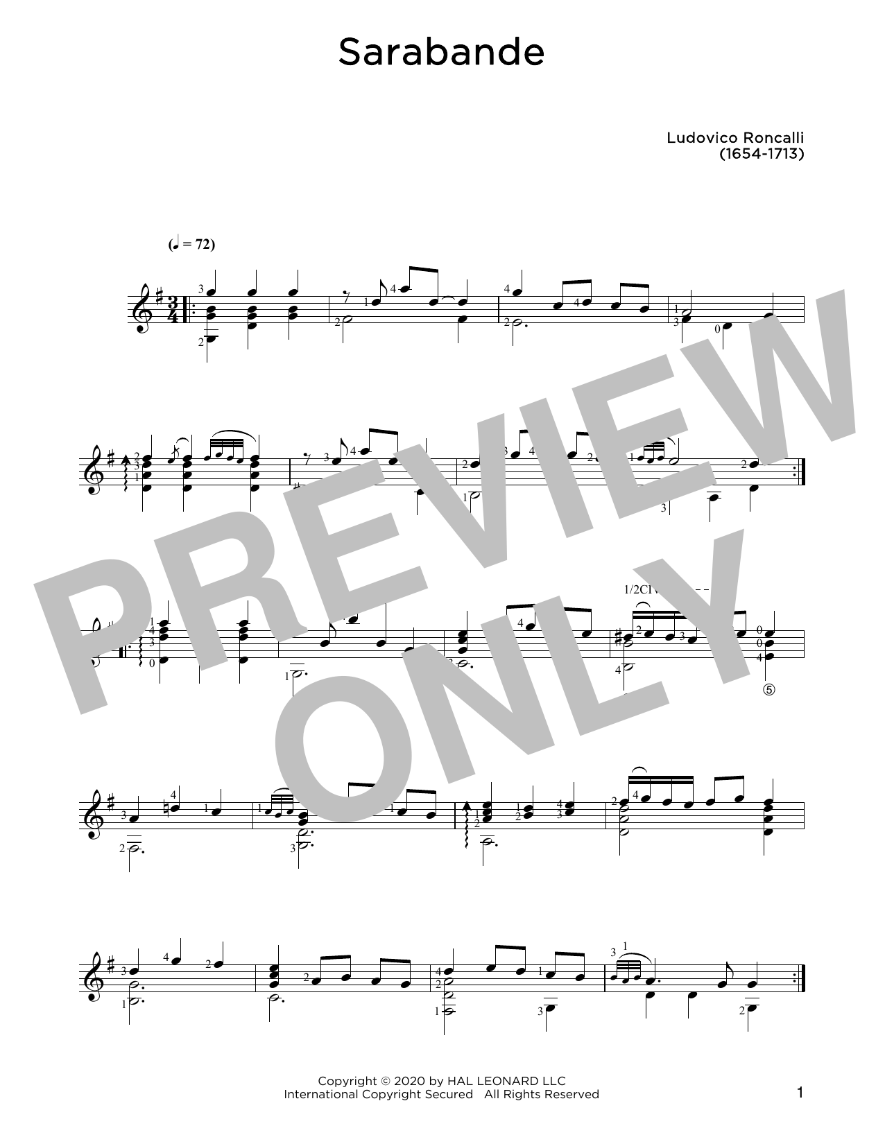 Download or print Ludovico Roncalli Sarabande sheet music, chords and digital score arranged for Solo Guitar. This Baroque score includes 1 page(s).