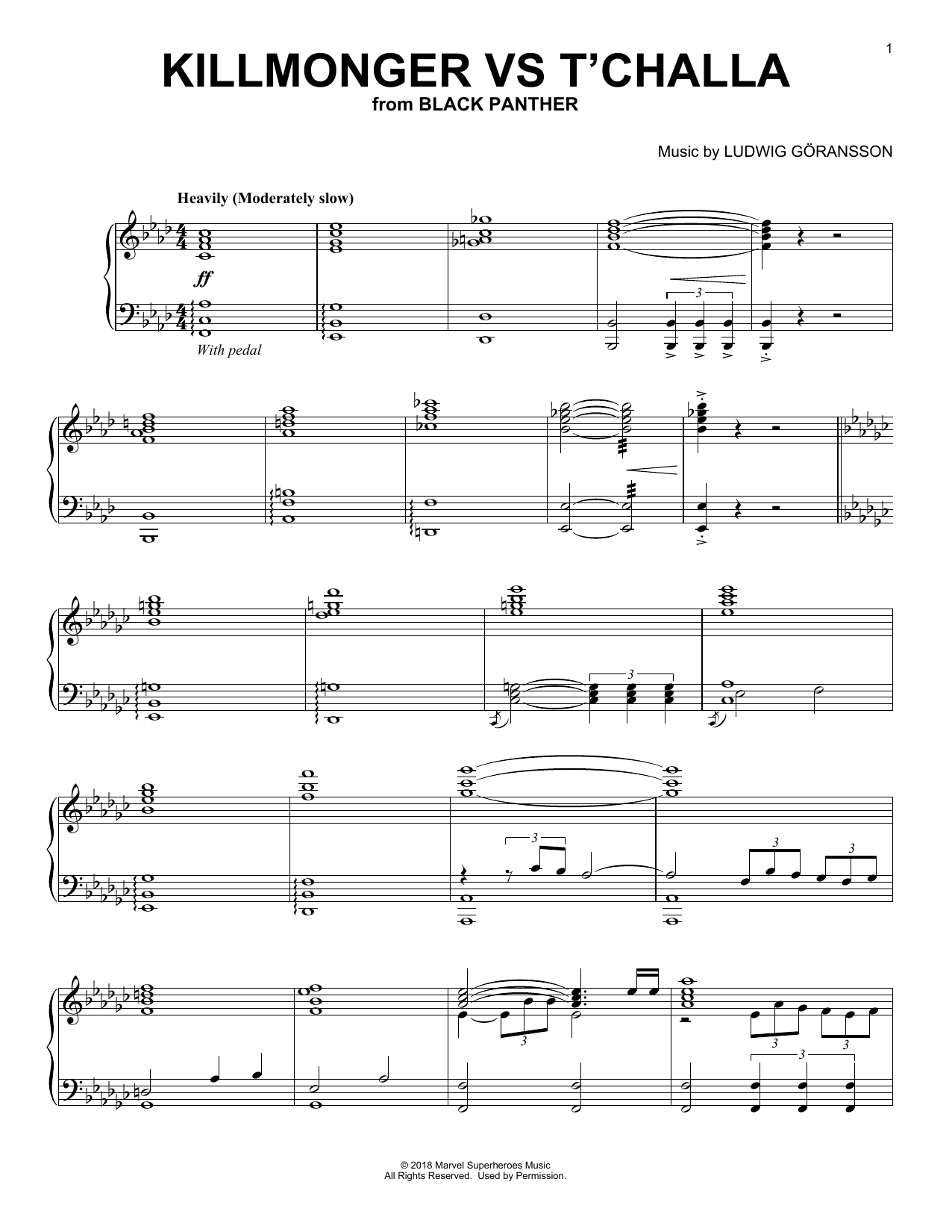 Download or print Ludwig Göransson Killmonger Vs T'Challa (from Black Panther) sheet music, chords and digital score arranged for Piano Solo. This Film/TV score includes 2 page(s).