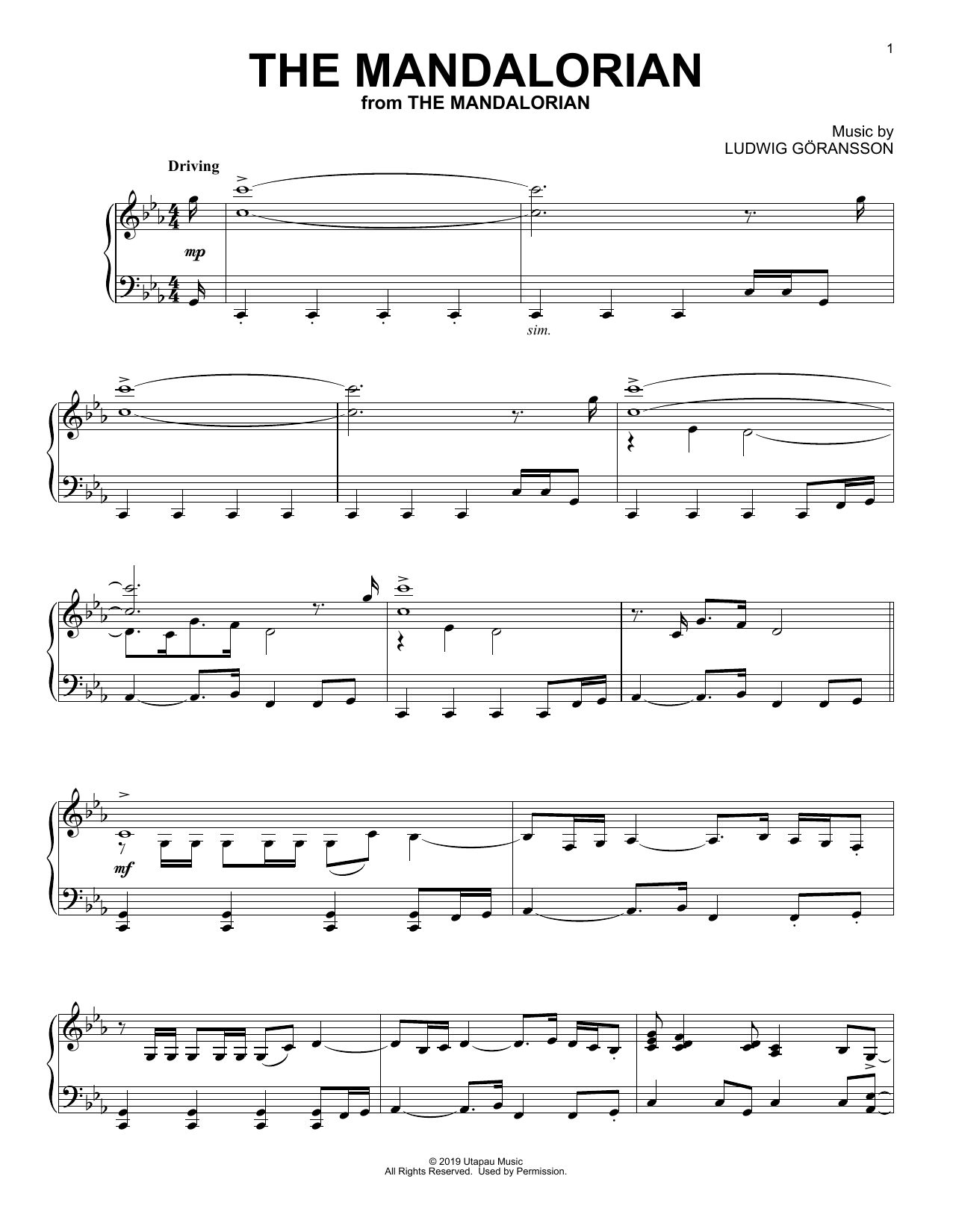 Download or print Ludwig Göransson The Mandalorian (from Star Wars: The Mandalorian) sheet music, chords and digital score arranged for Piano Solo. This Film/TV score includes 4 page(s).