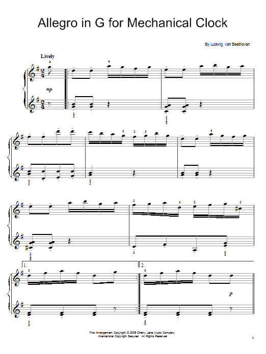 Download or print Ludwig van Beethoven Allegro in G for Mechanical Clock sheet music, chords and digital score arranged for Easy Piano. This Classical score includes 2 page(s).
