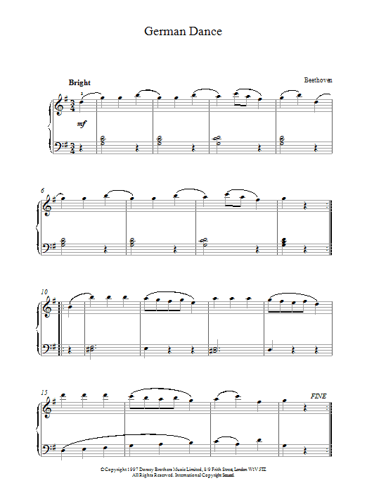 Download or print Ludwig van Beethoven German Dance sheet music, chords and digital score arranged for Piano Solo. This Classical score includes 2 page(s).
