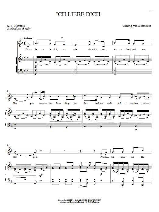 Download or print Ludwig van Beethoven Ich Liebe Dich (I Love You) (Beethoven) sheet music, chords and digital score arranged for Piano & Vocal. This Classical score includes 3 page(s).