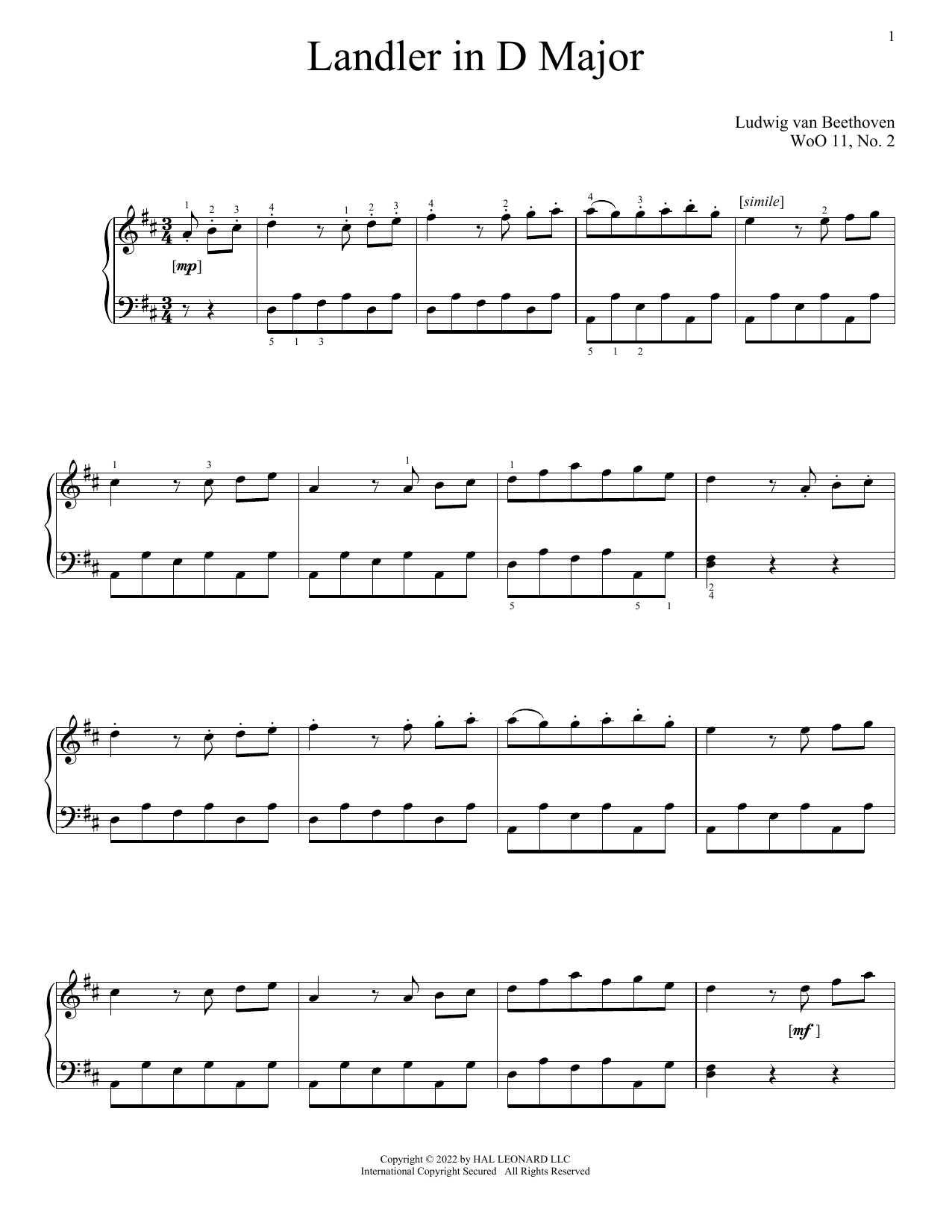 Download or print Ludwig van Beethoven Landler In D Major, WoO 11, No. 2 sheet music, chords and digital score arranged for Piano Solo. This Classical score includes 2 page(s).