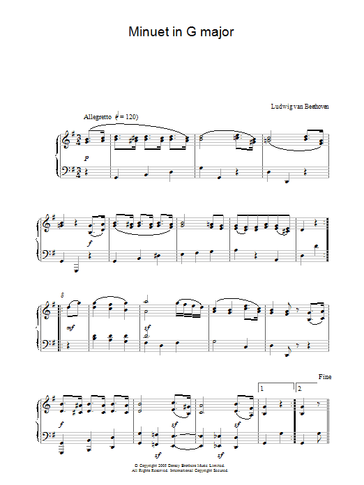 Download or print Ludwig van Beethoven Minuet In G Major sheet music, chords and digital score arranged for Cello and Piano. This Classical score includes 1 page(s).