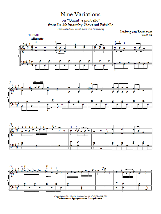 Download or print Ludwig van Beethoven Nine Variations On "Quant' E Piu Bello" (arr. Immanuela Gruenberg) sheet music, chords and digital score arranged for Piano Solo. This Pop score includes 12 page(s).