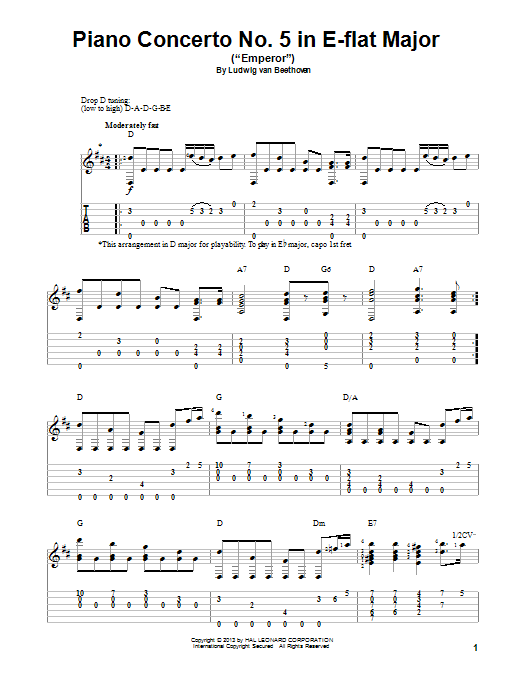 Download or print Ludwig van Beethoven Piano Concerto No. 5 in E-flat Major ("Emperor") sheet music, chords and digital score arranged for Solo Guitar. This Classical score includes 2 page(s).