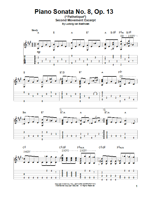 Download or print Ludwig van Beethoven Piano Sonata No. 8, Op. 13 ("Pathetique"), 2nd Movement sheet music, chords and digital score arranged for Solo Guitar. This Classical score includes 2 page(s).