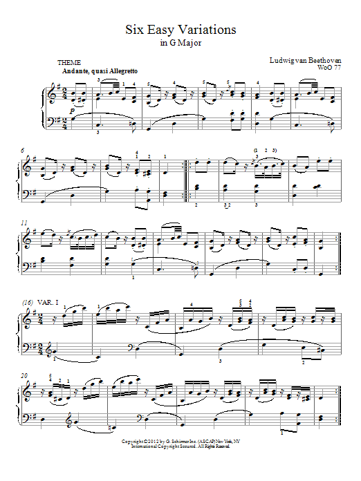 Download or print Ludwig van Beethoven Six Variations In G Major, WoO 77 sheet music, chords and digital score arranged for Piano Solo. This Classical score includes 8 page(s).