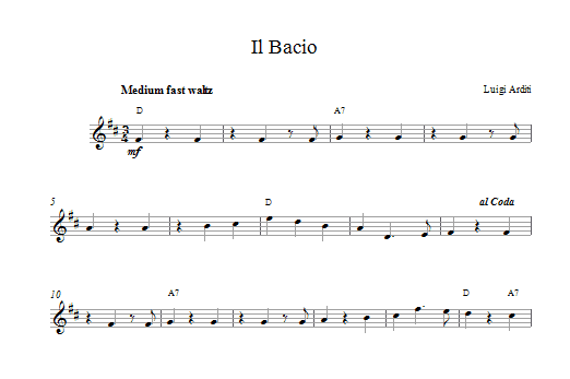 Download or print Luigi Arditi Il Bacio (The Kiss) sheet music, chords and digital score arranged for Piano, Vocal & Guitar Chords (Right-Hand Melody). This Christmas score includes 3 page(s).