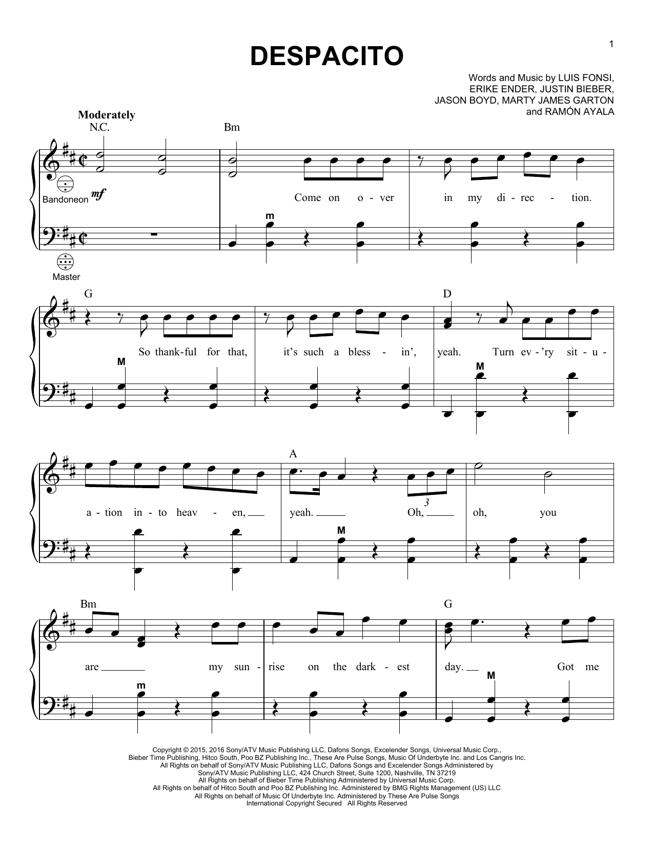 Download or print Luis Fonsi & Daddy Yankee feat. Justin Bieber Despacito (arr. Gary Meisner) sheet music, chords and digital score arranged for Accordion. This Pop score includes 8 page(s).