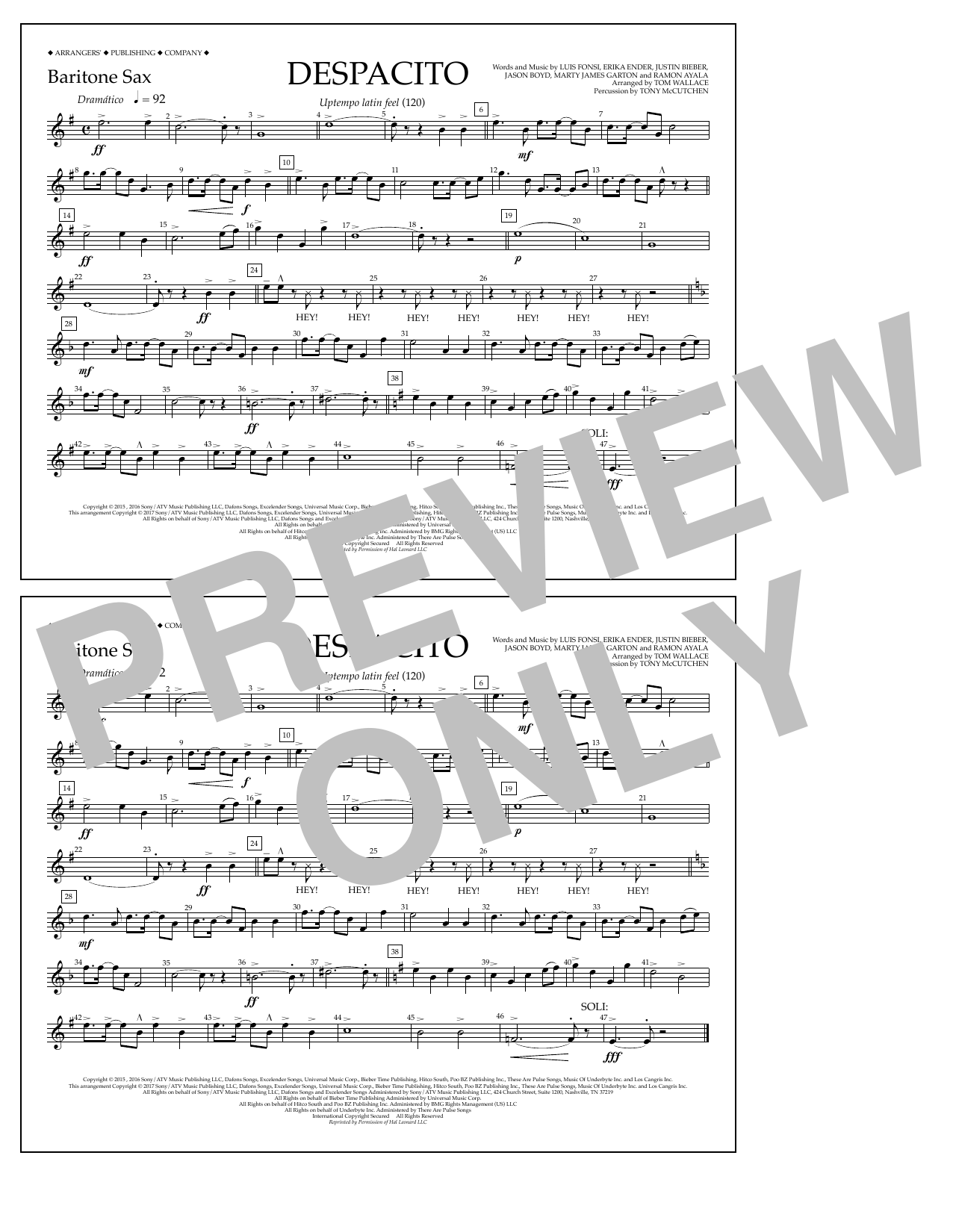 Download or print Luis Fonsi & Daddy Yankee feat. Justin Bieber Despacito (arr. Tom Wallace) - Baritone Sax sheet music, chords and digital score arranged for Marching Band. This Pop score includes 1 page(s).