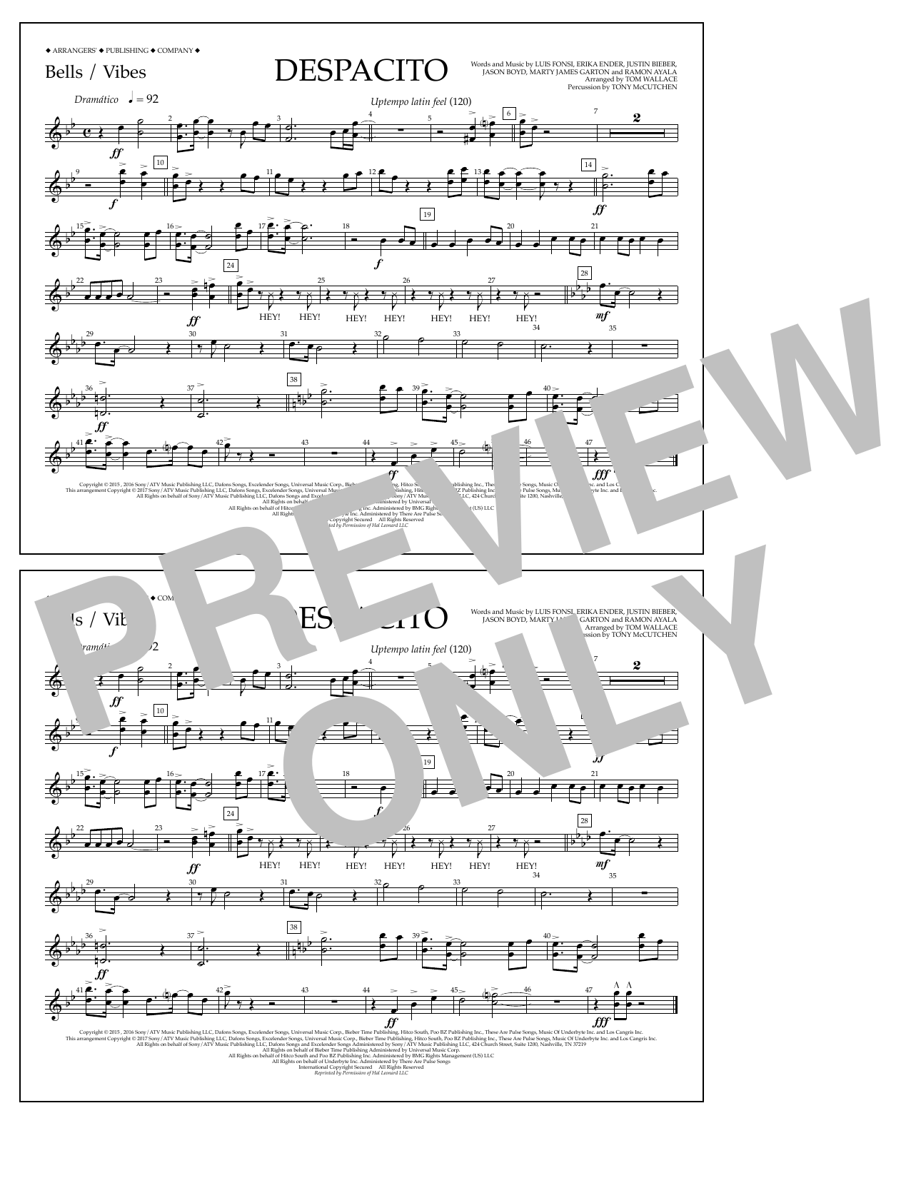 Download or print Luis Fonsi & Daddy Yankee feat. Justin Bieber Despacito (arr. Tom Wallace) - Bells/Vibes sheet music, chords and digital score arranged for Marching Band. This Pop score includes 1 page(s).