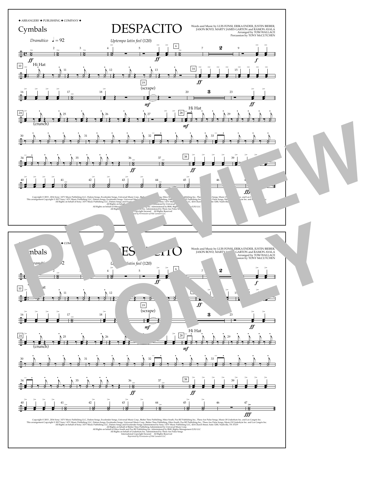 Download or print Luis Fonsi & Daddy Yankee feat. Justin Bieber Despacito (arr. Tom Wallace) - Cymbals sheet music, chords and digital score arranged for Marching Band. This Pop score includes 1 page(s).