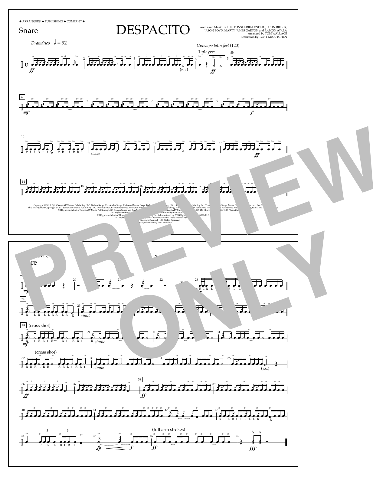 Download or print Luis Fonsi & Daddy Yankee feat. Justin Bieber Despacito (arr. Tom Wallace) - Snare sheet music, chords and digital score arranged for Marching Band. This Pop score includes 1 page(s).