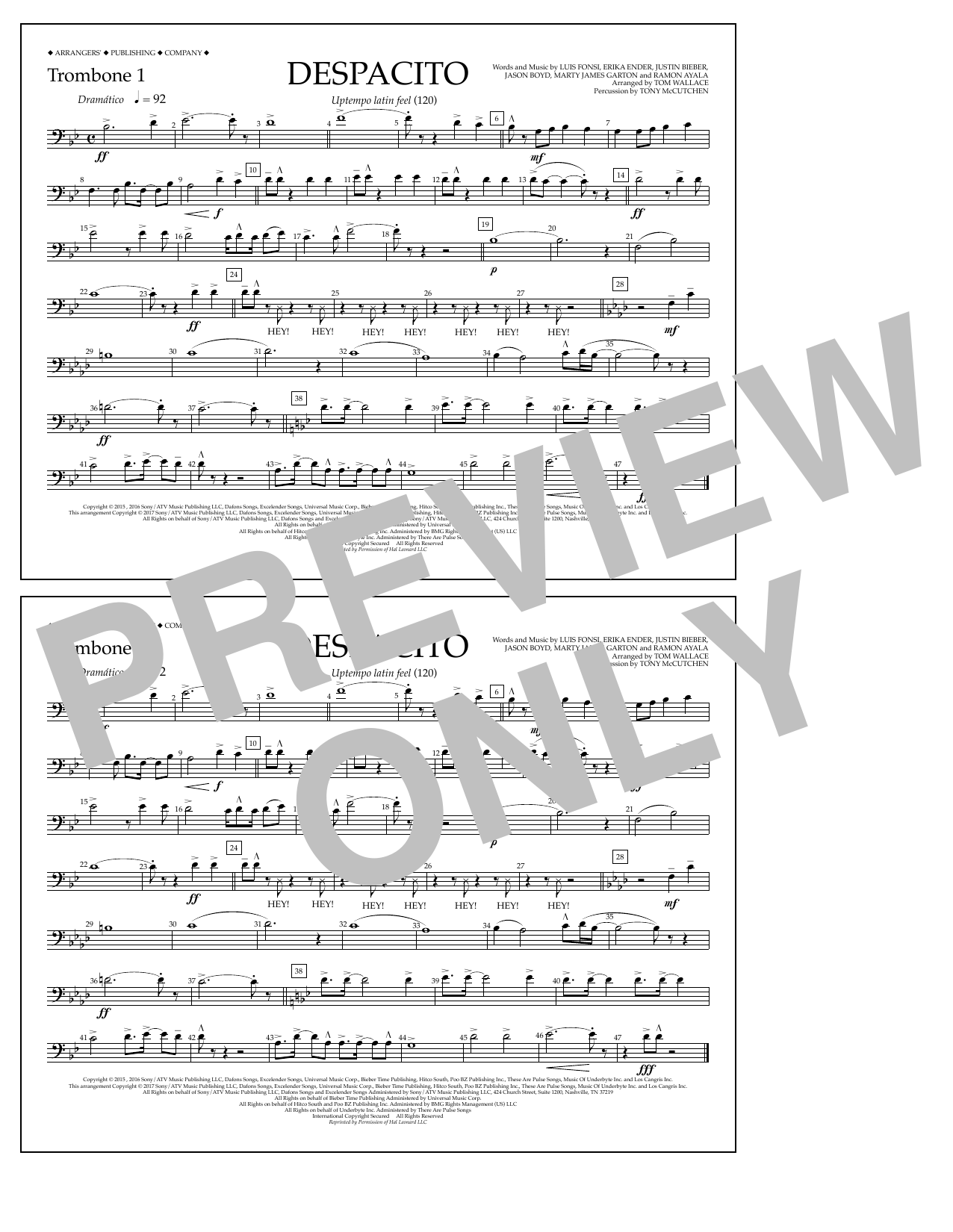 Download or print Luis Fonsi & Daddy Yankee feat. Justin Bieber Despacito (arr. Tom Wallace) - Trombone 1 sheet music, chords and digital score arranged for Marching Band. This Pop score includes 1 page(s).