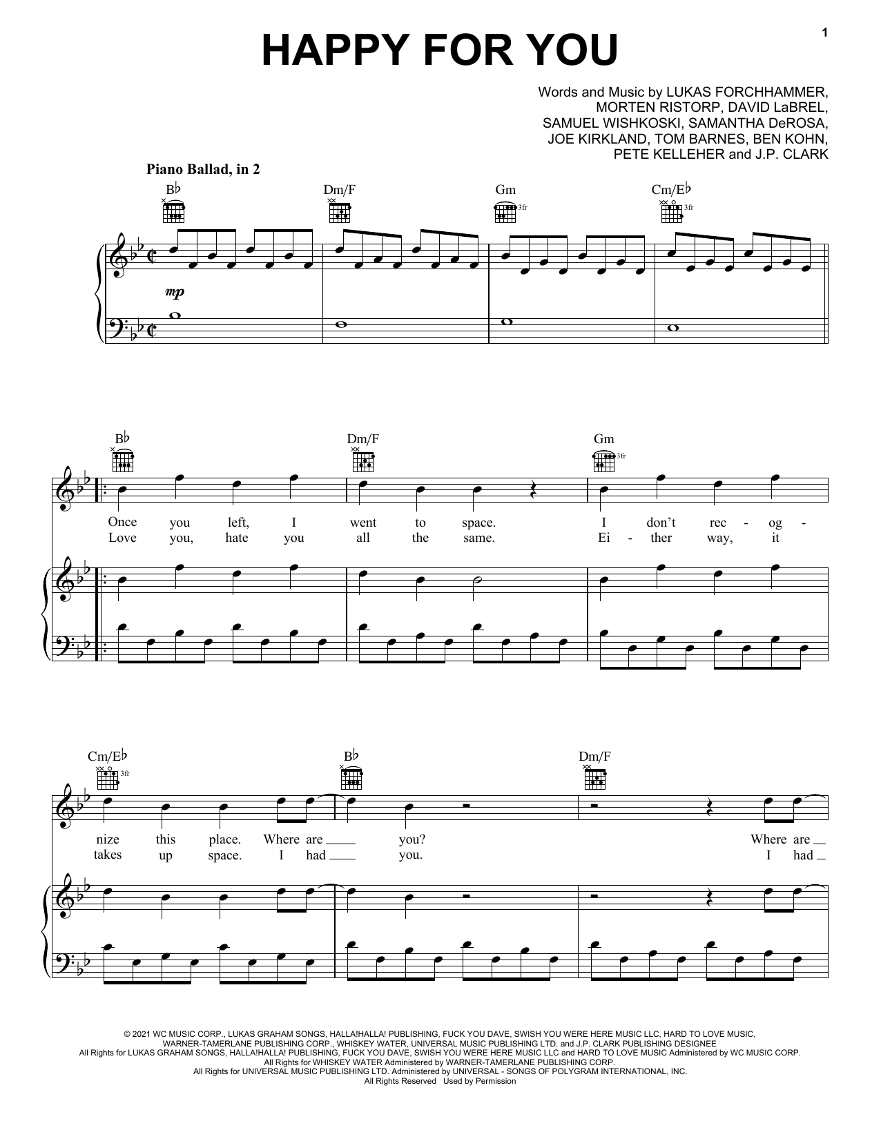 Download or print Lukas Graham Happy For You sheet music, chords and digital score arranged for Piano, Vocal & Guitar Chords (Right-Hand Melody). This Pop score includes 7 page(s).