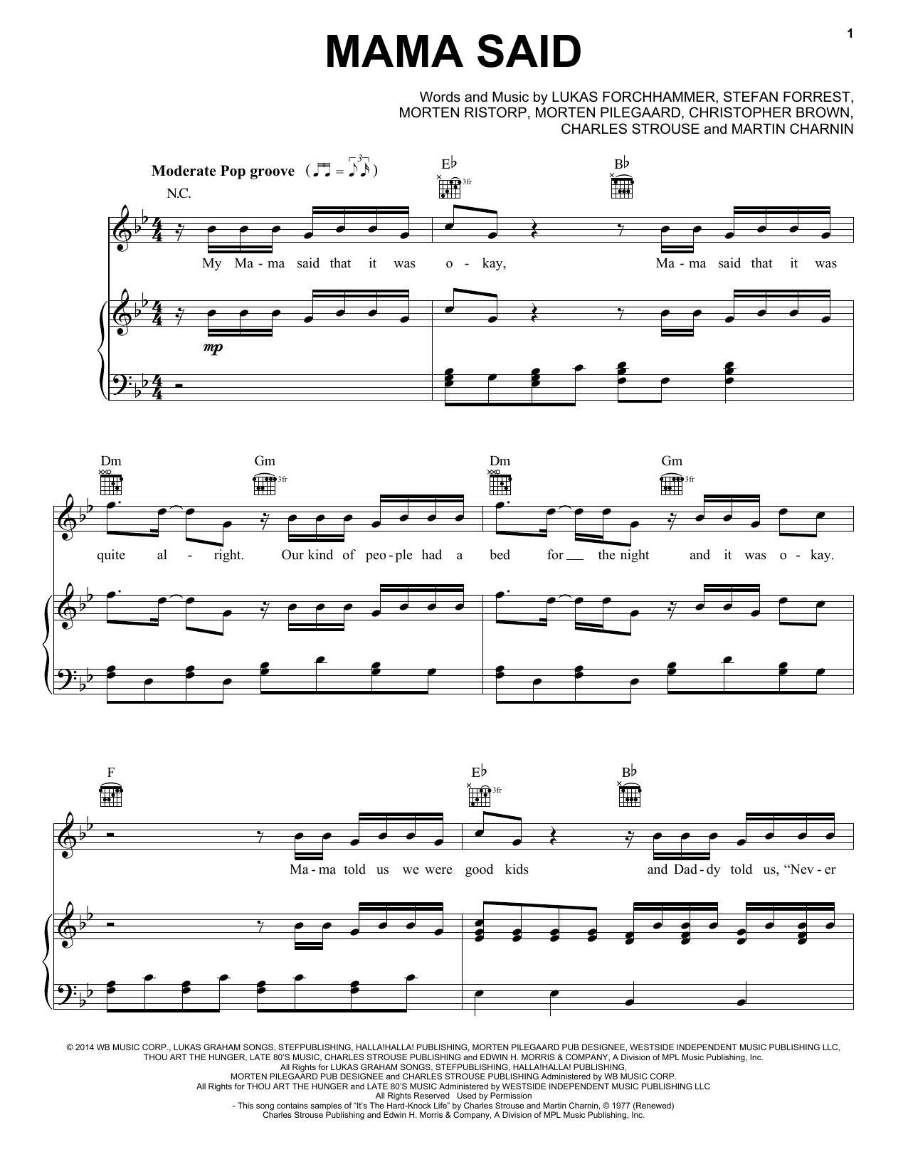 Download or print Lukas Graham Mama Said sheet music, chords and digital score arranged for Piano, Vocal & Guitar Chords (Right-Hand Melody). This Pop score includes 6 page(s).