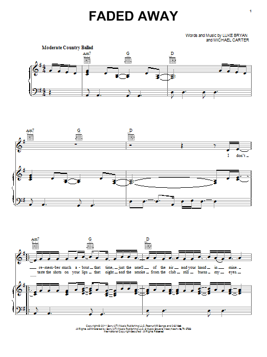 Download or print Luke Bryan Faded Away sheet music, chords and digital score arranged for Piano, Vocal & Guitar Chords (Right-Hand Melody). This Pop score includes 5 page(s).