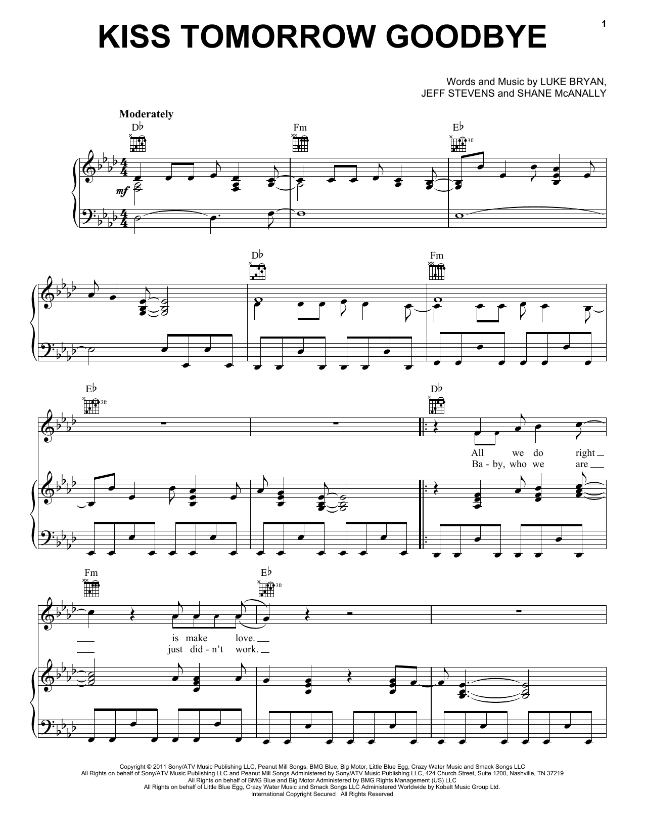 Download or print Luke Bryan Kiss Tomorrow Goodbye sheet music, chords and digital score arranged for Piano, Vocal & Guitar Chords (Right-Hand Melody). This Pop score includes 5 page(s).