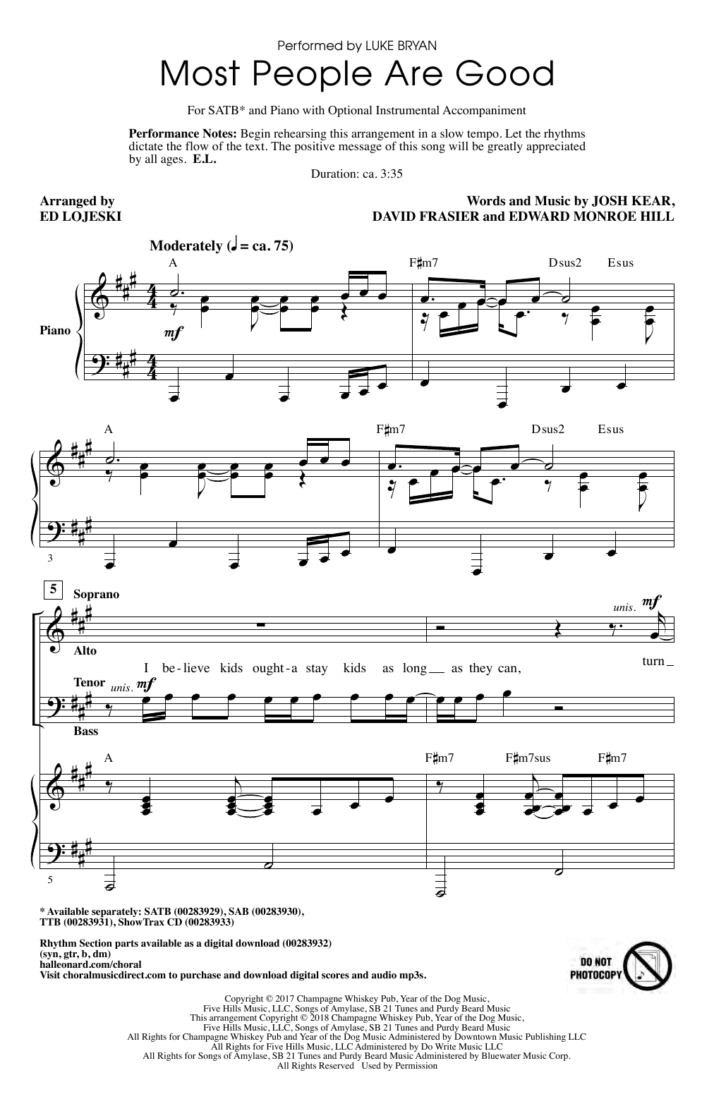 Download or print Luke Bryan Most People Are Good (arr. Ed Lojeski) sheet music, chords and digital score arranged for TTBB Choir. This Pop score includes 10 page(s).