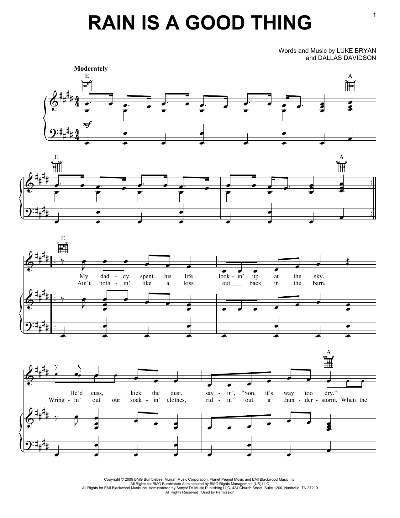 Download or print Luke Bryan Rain Is A Good Thing sheet music, chords and digital score arranged for Piano, Vocal & Guitar Chords (Right-Hand Melody). This Country score includes 5 page(s).