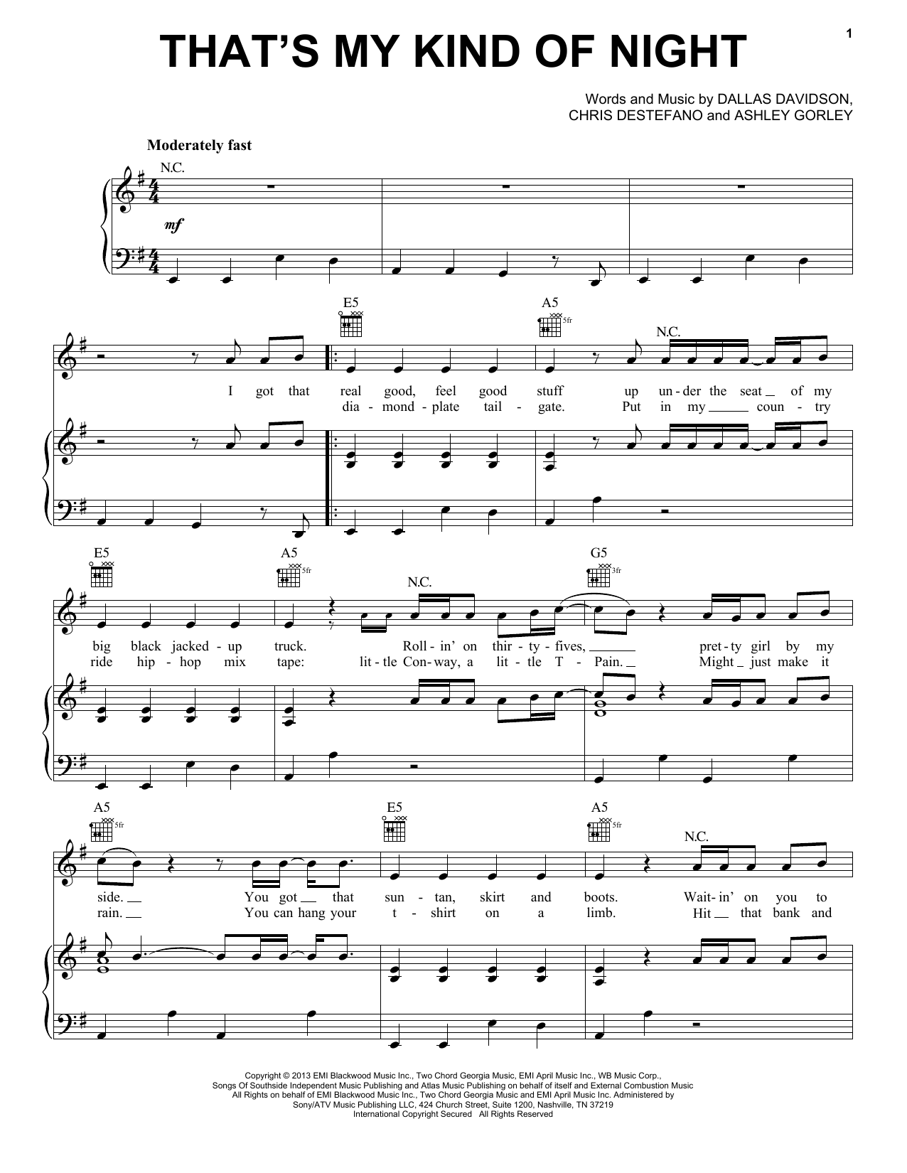 Download or print Luke Bryan That's My Kind Of Night sheet music, chords and digital score arranged for Piano, Vocal & Guitar Chords (Right-Hand Melody). This Pop score includes 5 page(s).