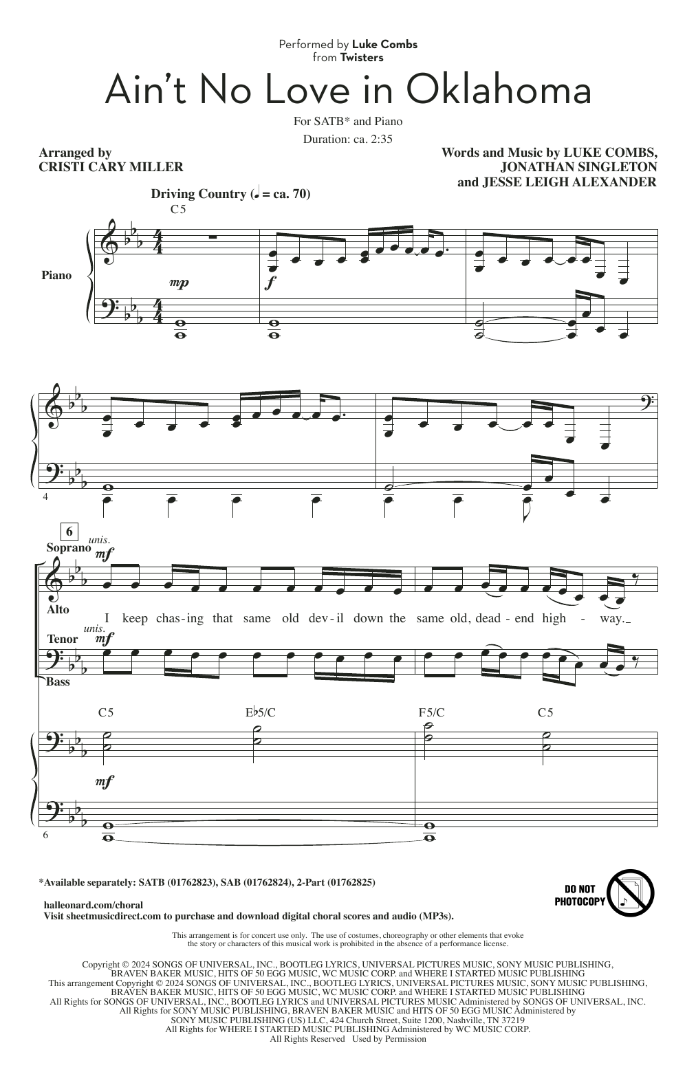 Download or print Luke Combs Ain't No Love In Oklahoma (from Twisters) (arr. Cristi Cary Miller) sheet music, chords and digital score arranged for SAB Choir. This Country score includes 7 page(s).