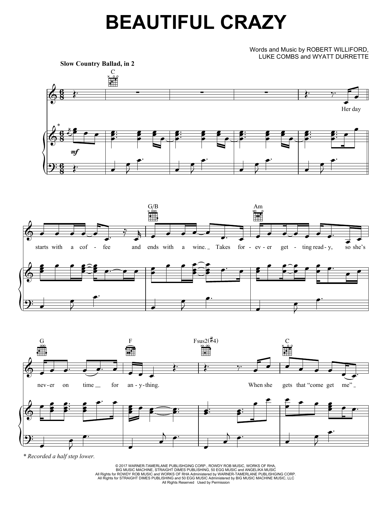 Download or print Luke Combs Beautiful Crazy sheet music, chords and digital score arranged for Piano, Vocal & Guitar Chords (Right-Hand Melody). This Pop score includes 5 page(s).