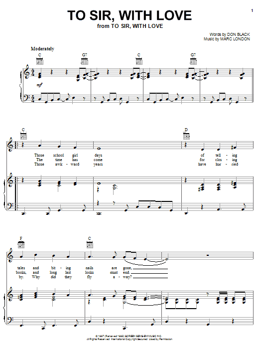 Download or print Lulu To Sir, With Love sheet music, chords and digital score arranged for Piano, Vocal & Guitar Chords (Right-Hand Melody). This Film/TV score includes 3 page(s).