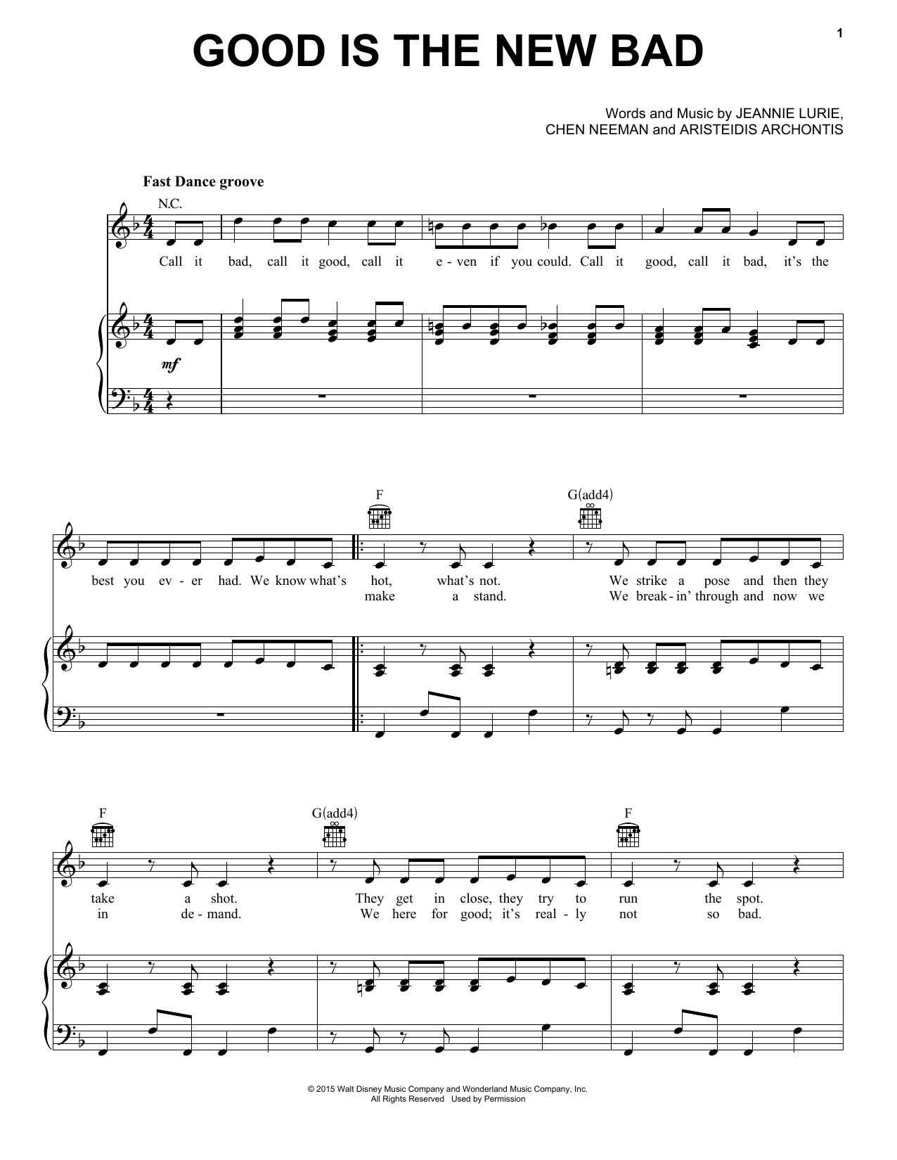 Download or print Lurie, Neeman, & Archontis Good Is The New Bad (from Disney's Descendants) sheet music, chords and digital score arranged for Piano, Vocal & Guitar Chords (Right-Hand Melody). This Children score includes 5 page(s).
