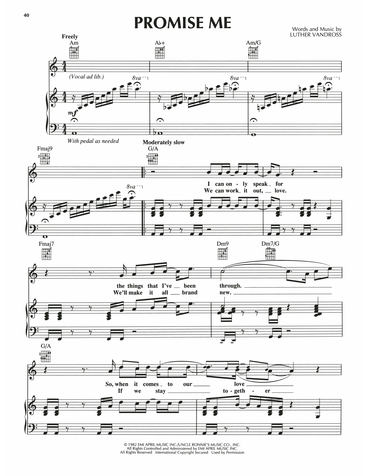 Download or print Luther Vandross Promise Me sheet music, chords and digital score arranged for Piano, Vocal & Guitar Chords (Right-Hand Melody). This Pop score includes 4 page(s).