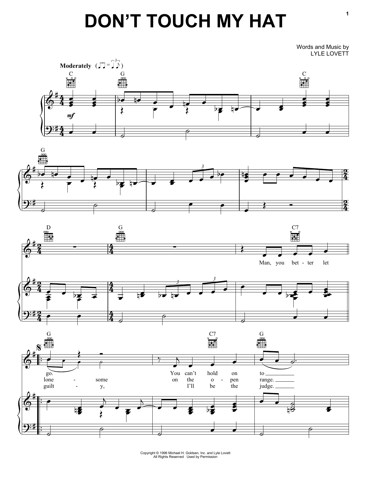 Download or print Lyle Lovett Don't Touch My Hat sheet music, chords and digital score arranged for Piano, Vocal & Guitar Chords (Right-Hand Melody). This Pop score includes 6 page(s).