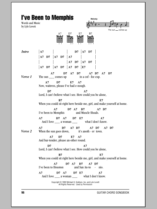 Download or print Lyle Lovett I've Been To Memphis sheet music, chords and digital score arranged for Piano, Vocal & Guitar Chords (Right-Hand Melody). This Folk score includes 7 page(s).