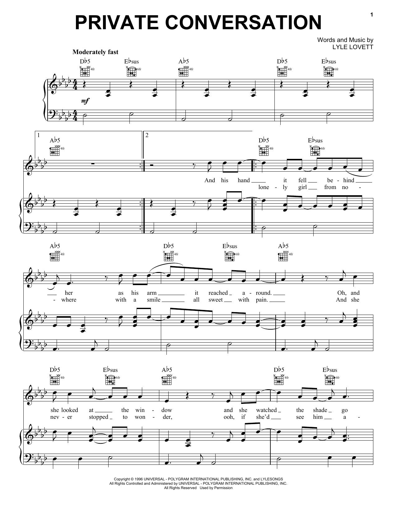 Download or print Lyle Lovett Private Conversation sheet music, chords and digital score arranged for Piano, Vocal & Guitar Chords (Right-Hand Melody). This Pop score includes 9 page(s).