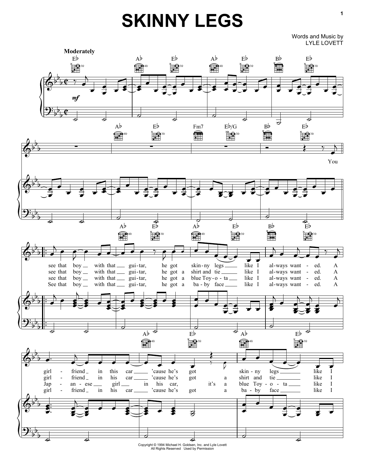 Download or print Lyle Lovett Skinny Legs sheet music, chords and digital score arranged for Piano, Vocal & Guitar Chords (Right-Hand Melody). This Pop score includes 4 page(s).