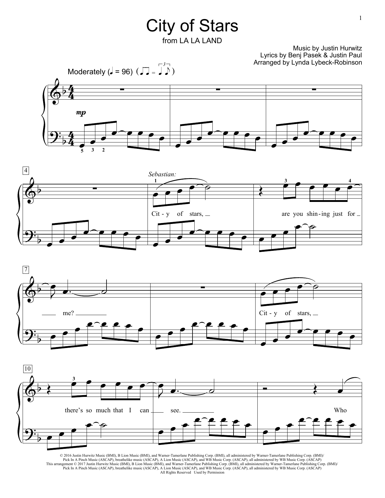Download or print Justin Hurwitz City Of Stars (from La La Land) (arr. Lynda Lybeck-Robinson) sheet music, chords and digital score arranged for Educational Piano. This Instructional score includes 5 page(s).