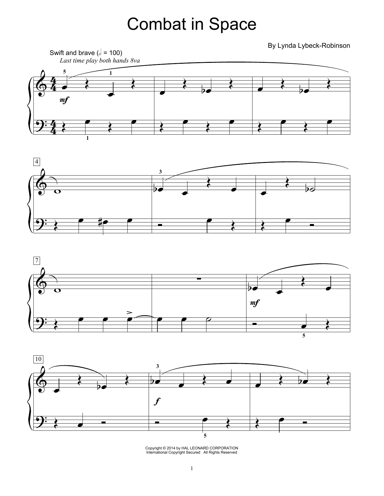 Download or print Lynda Lybeck-Robinson Combat In Space sheet music, chords and digital score arranged for Piano Solo. This Instructional score includes 1 page(s).