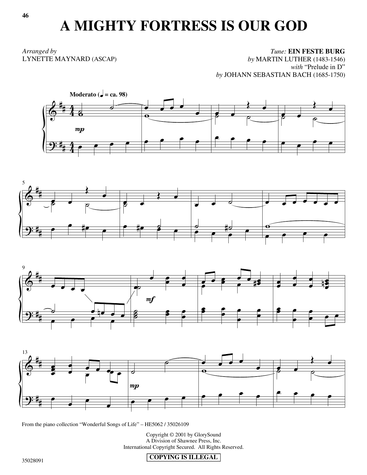 Download or print Lynette Maynard A Mighty Fortress Is Our God (with "Prelude in D") sheet music, chords and digital score arranged for Piano Solo. This Concert score includes 4 page(s).